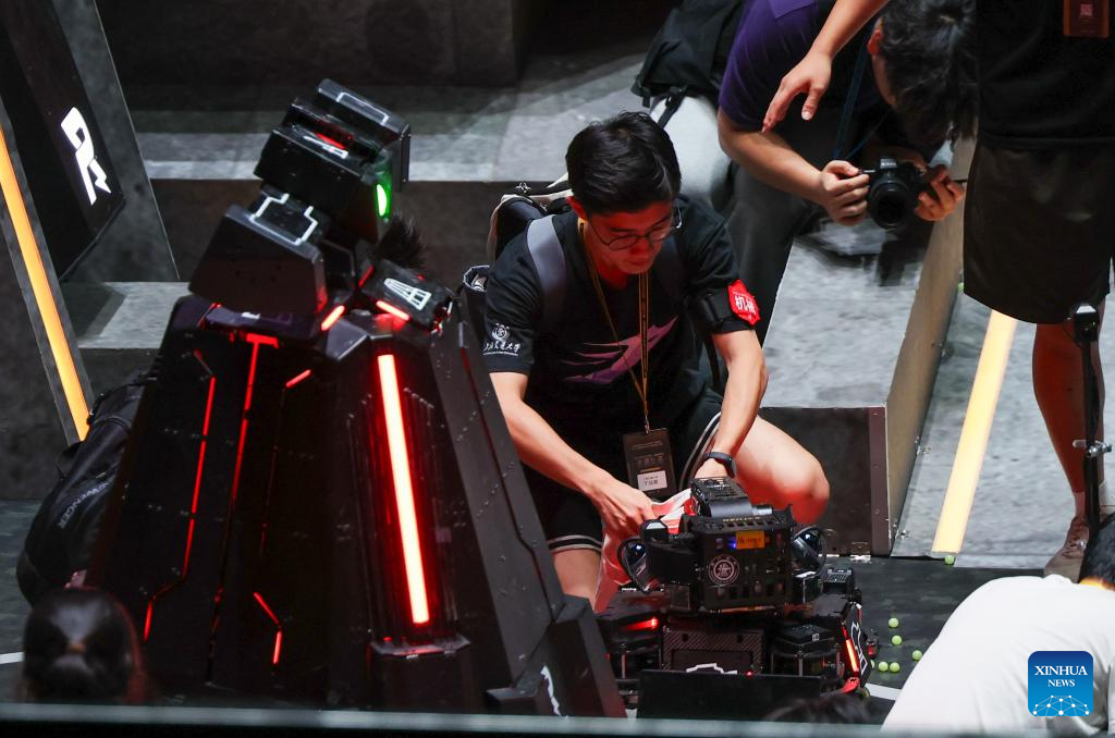 A member of Jiaoloong team from Shanghai Jiao Tong University sets up a robot during the RoboMaster University Championship (RMUC 2025) Final of the 24th China University Robot Competition, in Shenzhen, south China's Guangdong Province, Aug. 3, 2025. The competition was concluded here on Aug. 3, with Jiaoloong team from Shanghai Jiao Tong University winning the championship.