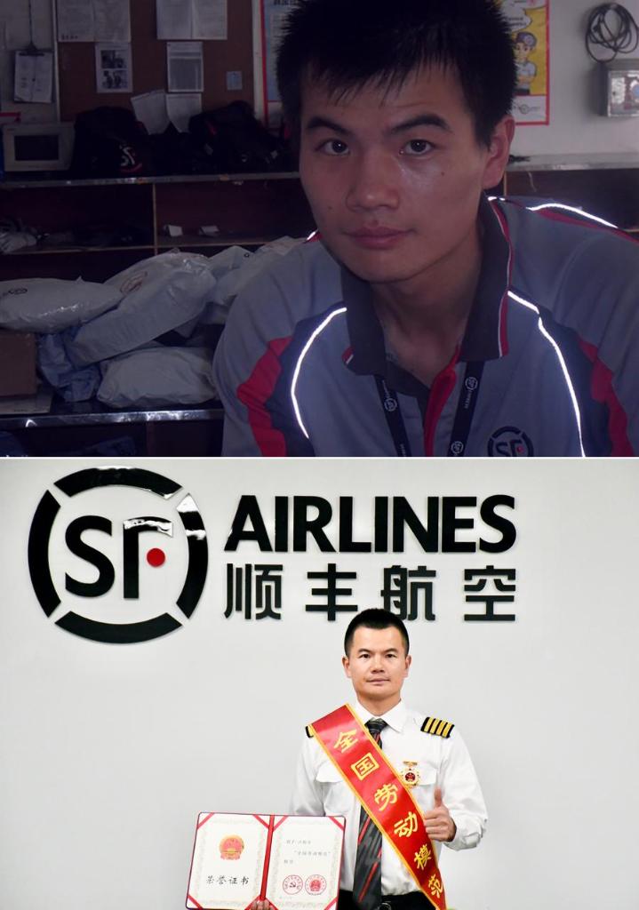 This combo photo shows newly recruited Wang Qinjin posing for a photo at a warehouse of SF Express in Shenzhen, south China's Guangdong Province in 2009 (above), and Wang Qinjin, as a pilot at SF Airline, posing for a photo after winning the title of "national model worker" in April 2025. Wang joined SF Express in 2009 as a warehouse operator and later transitioned to a pilot role through the company's aviation talent selection program, before serving as a line captain in 2019.