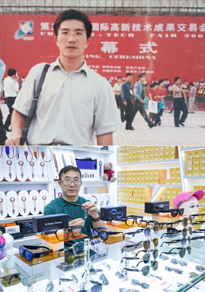 This combo photo shows Jiang Xiaolin posing for a photo at the third China High-Tech Fair held in Shenzhen in 2001 (above), and Jiang Xiaolin posing for a photo at his shop in Huaqiangbei on July 22, 2025, in Shenzhen, south China's Guangdong Province. Working in Huaqiangbei, one of the world's largest electronics markets packed with small shops selling all kinds of electronic gadgets, Jiang is adept at renewing product catalogs according to the changing market demand.