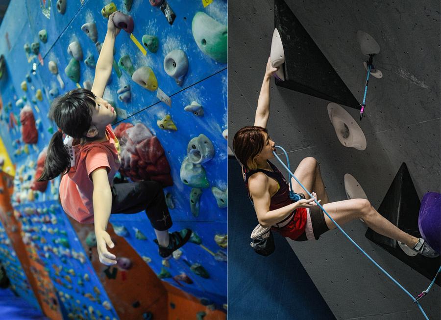 This combo photo shows 9-year-old Zhang Yuetong competing at a sport climbing event in Shenzhen, south China's Guangdong Province on Nov. 21, 2012 (L), and Zhang Yuetong competing at the IFSC World Cup Wujiang 2025 in Suzhou, east China's Jiangsu Province on April 25, 2025. Born in Shenzhen, Zhang started her sport climbing journey at the age of 4. She was among the Chinese delegation members for the 2024 Paris Olympic Games.