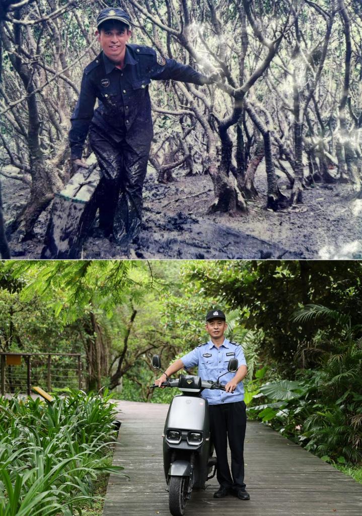 This combo photo shows Song Changhua posing for a photo in 2010 (above), and Song posing for a photo on Aug. 22, 2025, at the Futian mangrove nature reserve in Shenzhen, south China's Guangdong Province. Song, a 56-year-old ranger, has dedicated himself to protecting the forest and wintering migratory birds here for more than 20 years.
