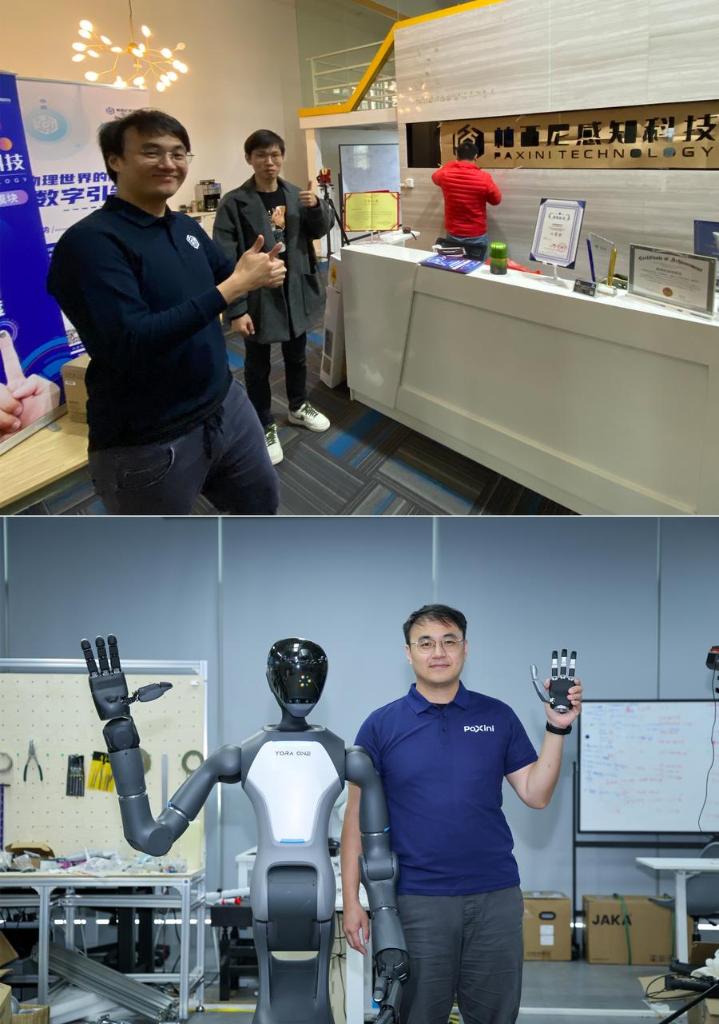 This combo photo shows Xu Jincheng (1st L) posing for a photo at a startup in 2021 (above), and Xu Jincheng, CEO of PaXini Technology, posing for a photo with a TORA-ONE humanoid robot at the headquarters of his company on Aug. 25, 2025, in Shenzhen, south China's Guangdong Province. Attracted by Shenzhen's inclusive environment, innovative atmosphere, sound industrial support, efficient government services, and rich human resources, many tech talents like Xu came here to boost robot research and development.