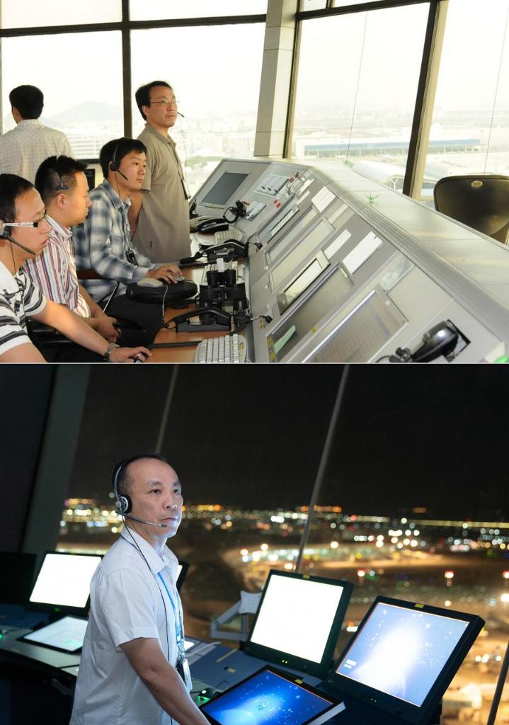 This combo photo shows He Jian (1st R) directing air traffic at the Shenzhen airport in 2005 (above), and He Jian on duty during a trial flight at the third runway of the airport on Aug. 26, 2025, in Shenzhen, south China's Guangdong Province. He joined Shenzhen air traffic control in 1995, and has since directed over a million flights, witnessing the rapid development of civil aviation industry in the city.