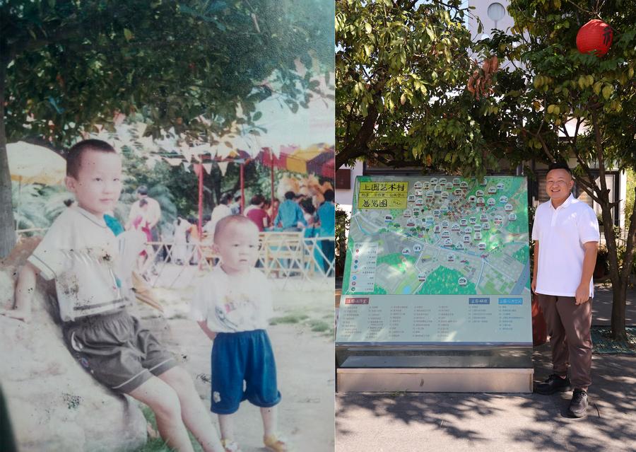 This combo photo shows 8-year-old Huang Binling (L) and his brother posing for a photo at a park in 2000 (Left), and Huang Binling posing for a photo in Shangwei Village on Aug. 22, 2025, in Shenzhen, south China's Guangdong Province. Growing up with his parents as migrant workers in Longhua District of Shenzhen, Huang has committed to revitalizing the ancient Shangwei Village after graduating from Peking University with a master degree in 2020.
