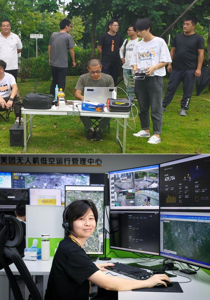 This combo photo shows newly recruited Liu Xingyao (R, front) attending a drone flight operation test on Oct. 10, 2021 (above), and Liu Xingyao working at the unmanned aircraft operation and management center of Chinese food delivery giant Meituan on Aug. 25, 2025, in Shenzhen, south China's Guangdong Province. Riding the wave of burgeoning low-altitude economy in Shenzhen, Liu leverages her specialized expertise by supervising Meituan's drone delivery routes.