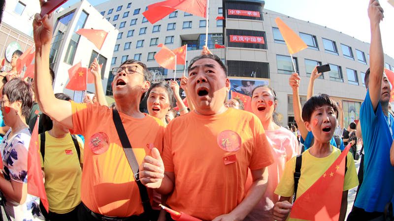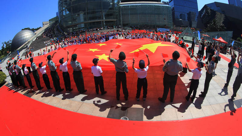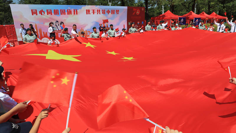 A huge flag-raising ceremony attended by teenagers from Hong Kong and Shenzhen as well as a flash mob featuring patriotic songs were held in Futian District this weekend.