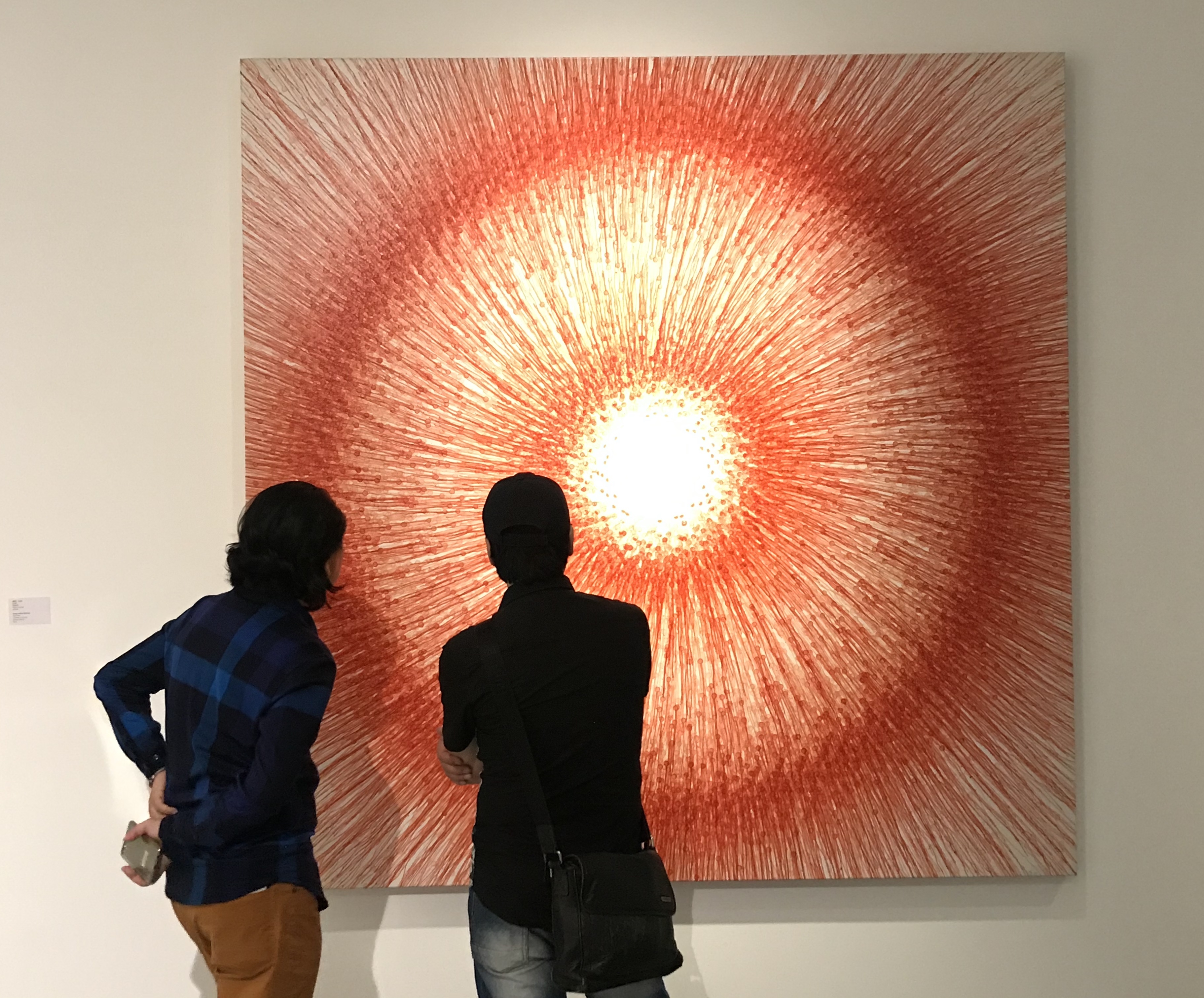Visitors observe Meng Luding’s cinnabar on canvas “Yuan Rate.”