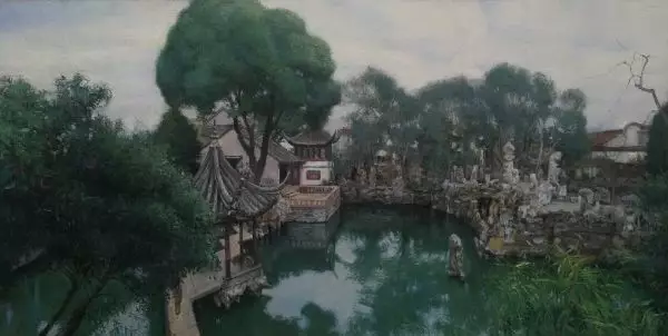 Zhang, also a CAFA graduate, displays several landscapes at the Artron show. The unique approach of light in his paintings gives life to the exuberant trees and Chinese gardens.