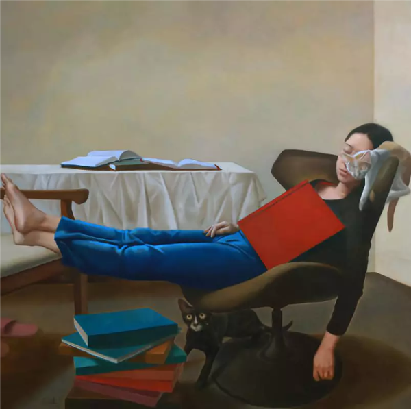 Wang, born in 1987 and the youngest of the five, graduated from the oil painting department of Minzu University of China. With bright contrastive colors, a cat or two hidden somewhere and the main subject always covering up half of their faces with a book or other things, his portraits are quite distinctive with a modern pop-art look.