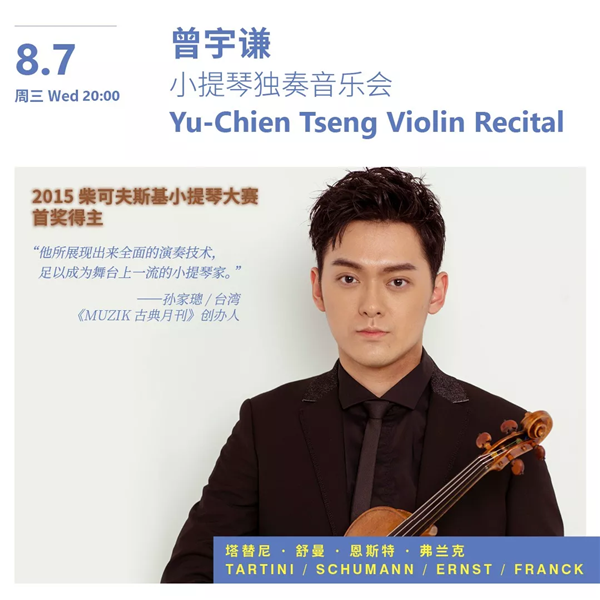 Young Taiwanese violinist Tseng Yu-chien, a graduate from the Curtis Institute of Music and an International Tchaikovsky Competition winner, will present Tartini’s “Devil’s Trill Sonata,” Schumann’s “Violin Sonata No. 1, Op. 105,” Franck’s “Sonata in A Major for Violin and Piano,” as well as Ernst’s famously difficult piece “The Last Rose of Summer,” on Aug. 7.