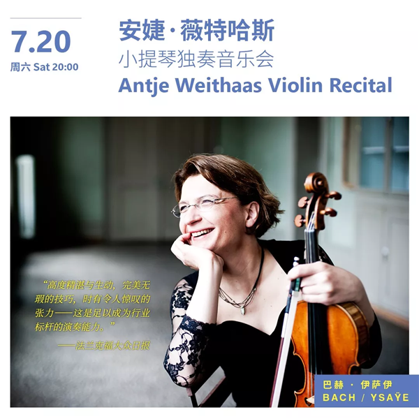 German violinist Antje Weithaas will show her compelling musical intelligence and technical mastery with pieces for solo violin. Bach’s “Partitas” No. 1 and 2, and Ysa?e’s “Sonatas for Solo Violin” No. 2 and 5 will be played at a concert July 20. This program, with pieces echoing between the Baroque period and the 20th century, places high technical demands on its performer. And audience members will enjoy prominent characteristics and violin techniques from the two contrasting periods.