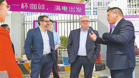 Jordi Valls (2nd R), deputy mayor of Barcelona, listens to an introduction while visiting Antuo Hill Depot — Shenzhen Bus Group's benchmark new energy vehicle charging station — yesterday. Two delegations from Barcelona are visiting Shenzhen to explore cooperation opportunities. This year marks the third anniversary of Shenzhen and Barcelona becoming friendly cities and the first anniversary of the opening of a direct flight rout