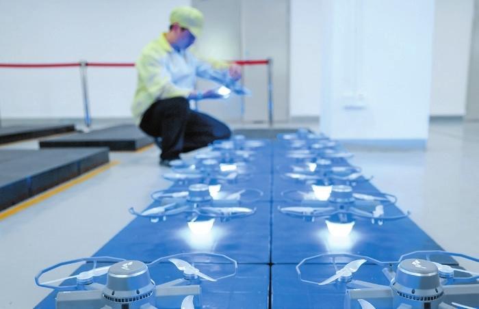 An employee tests drones at Damoda's production workshop in Longhua District on March 18, 2025.