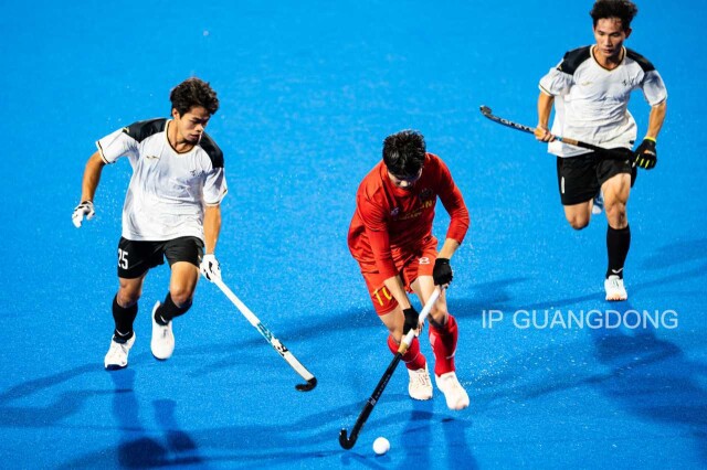 In the men's field hockey match, players compete fiercely for possession of the ball.