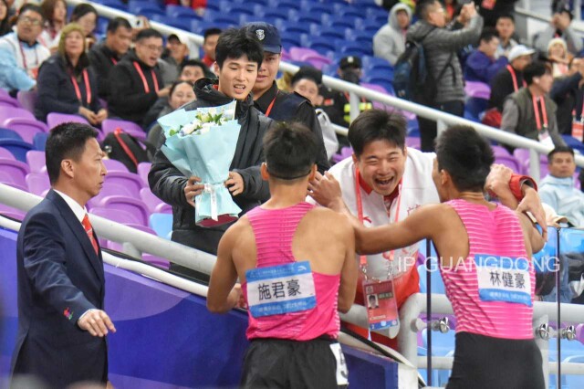In the men's 200m final, Guangdong athletes Shi Junhao and Lin Jianhao claimed the gold and silver medals respectively, embracing their coach in celebration.