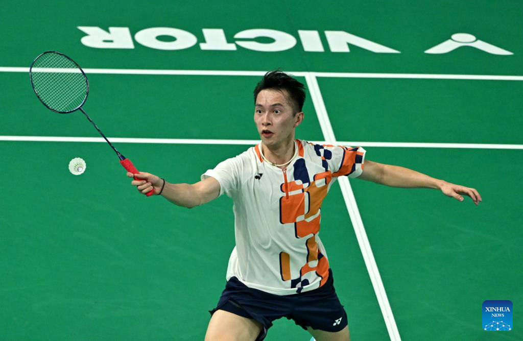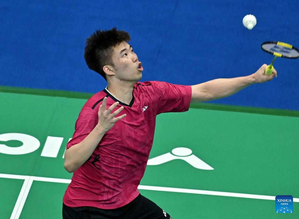 Ng Ka Long Angus of Hong Kong hits a return to Sun Chao of Zhejiang during the men's team group match of badminton at China's 15th National Games in Shenzhen, south China's Guangdong Province, Nov. 9, 2025.