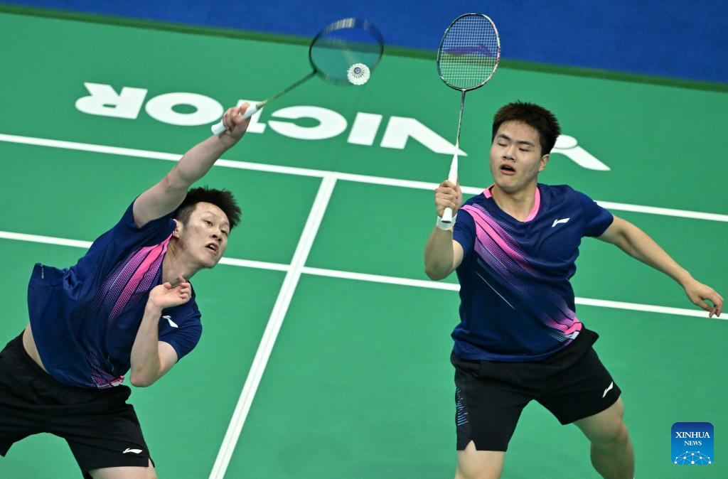 Liang Weikeng (R)/Ren Xiangyu of Guangdong compete against He Jiting/Lin Xiangyi of Fujian during the men's team group match of badminton at China's 15th National Games in Shenzhen, south China's Guangdong Province, Nov. 9, 2025.