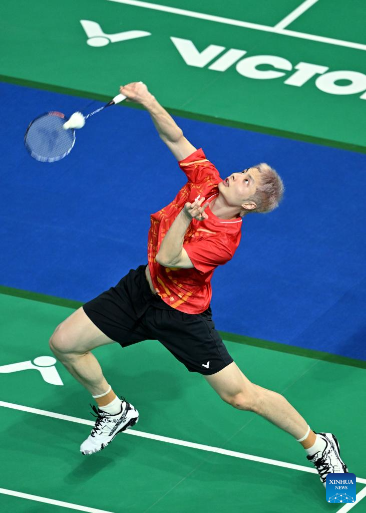 Shi Yuqi of Jiangsu hits a return to Zhu Xuanchen of Hubei during the men's team group match of badminton at China's 15th National Games in Shenzhen, south China's Guangdong Province, Nov. 9, 2025.