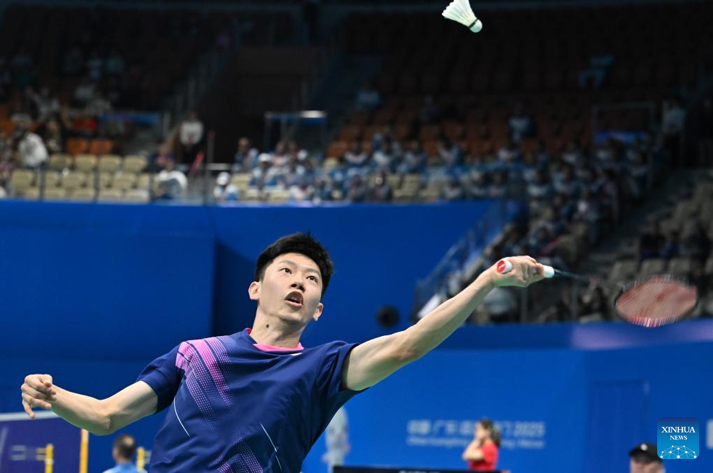 Lei Lanxi of Guangdong hits a return to Weng Hongyang of Fujian during the men's team group match of badminton at China's 15th National Games in Shenzhen, south China's Guangdong Province, Nov. 9, 2025.