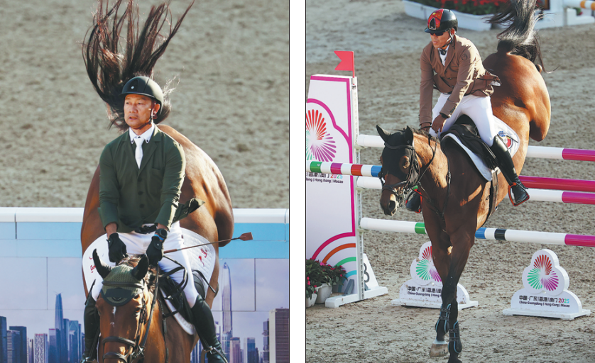 Li Zhenqiang (left) of Guangdong and Darima of Inner Mongolia put their riding skills on display during the National Games equestrian program in Shenzhen. Hong Kong show jumping specialist Raena Leung said that, a decade ago, riders from the special administrative region used to enjoy an obvious advantage at nationwide equestrian events, but that is no longer the case, as the competitive level of riders from the Chinese mainland