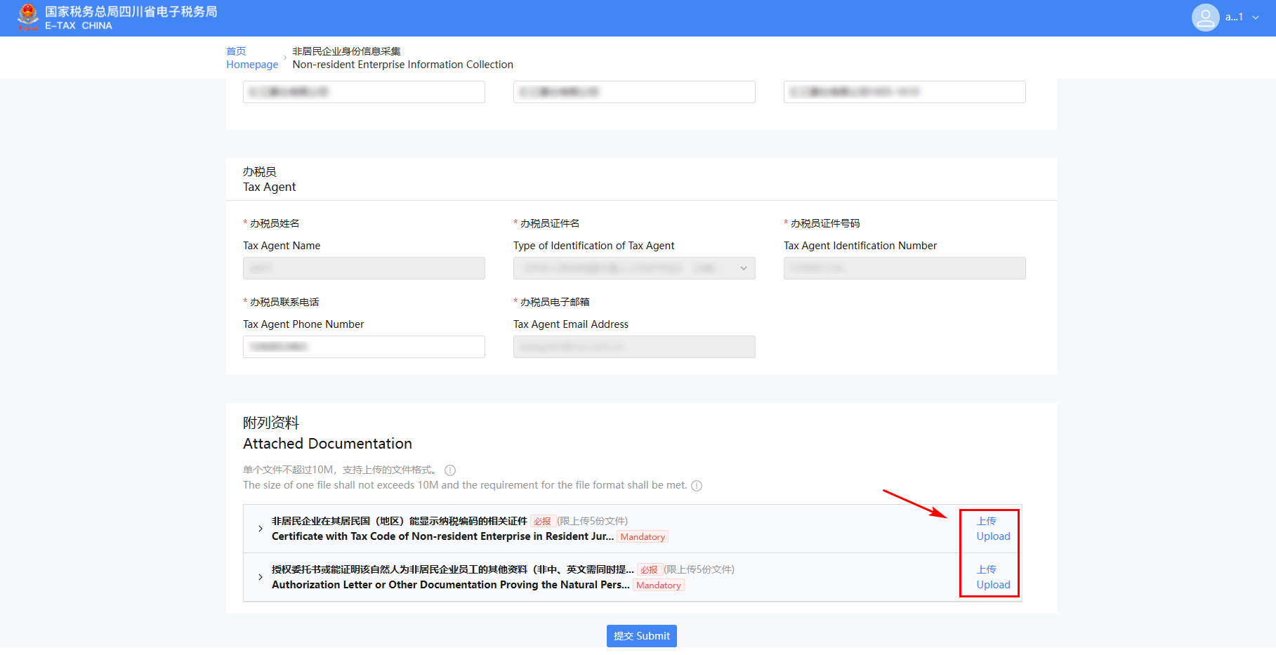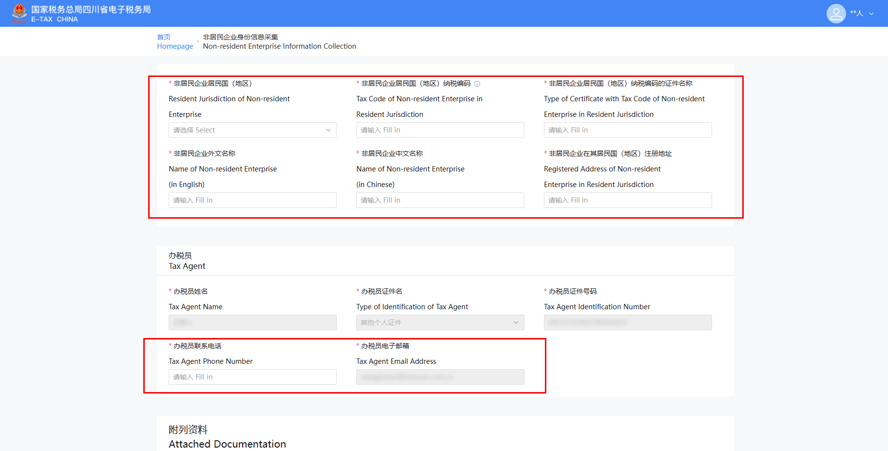 Step 3: Enter relevant information on the page of Non-resident Enterprise Information Collection. If the "Tax Agent Phone Number" or "Tax Agent Email Address" is missing, please manually enter it/them.