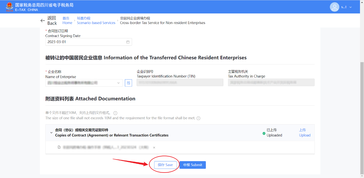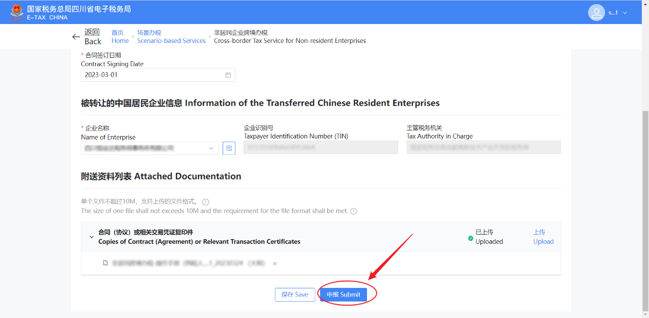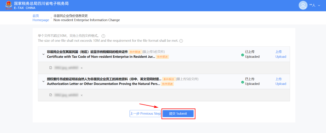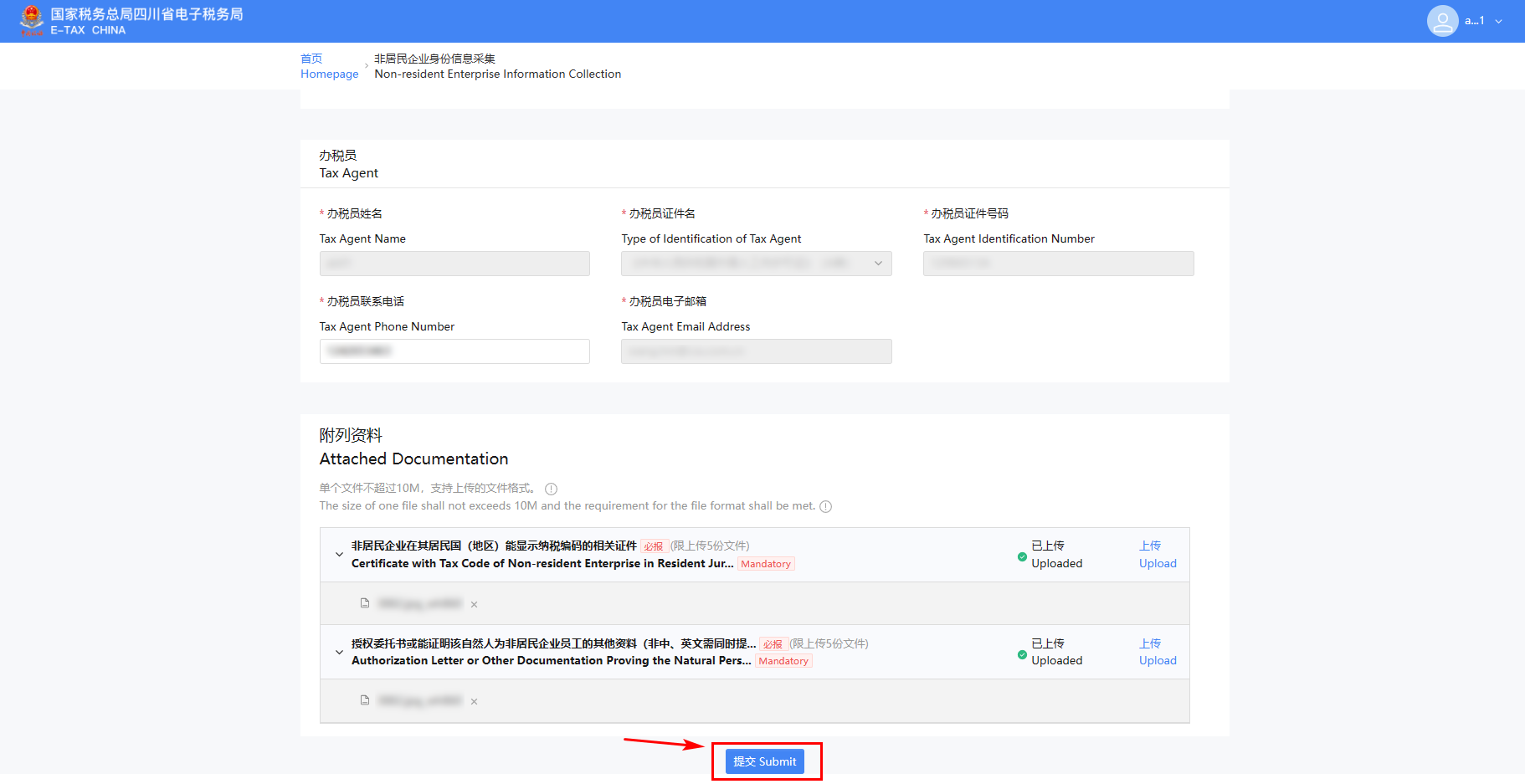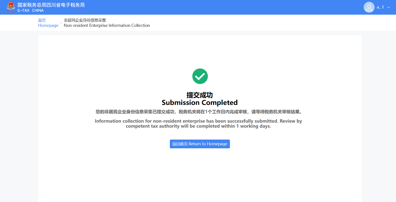Step 6: If the submission is successful, the system will prompt “Information for non-resident enterprise has been successfully submitted. Review by the tax authority in charge will be completed within 1 working day.”