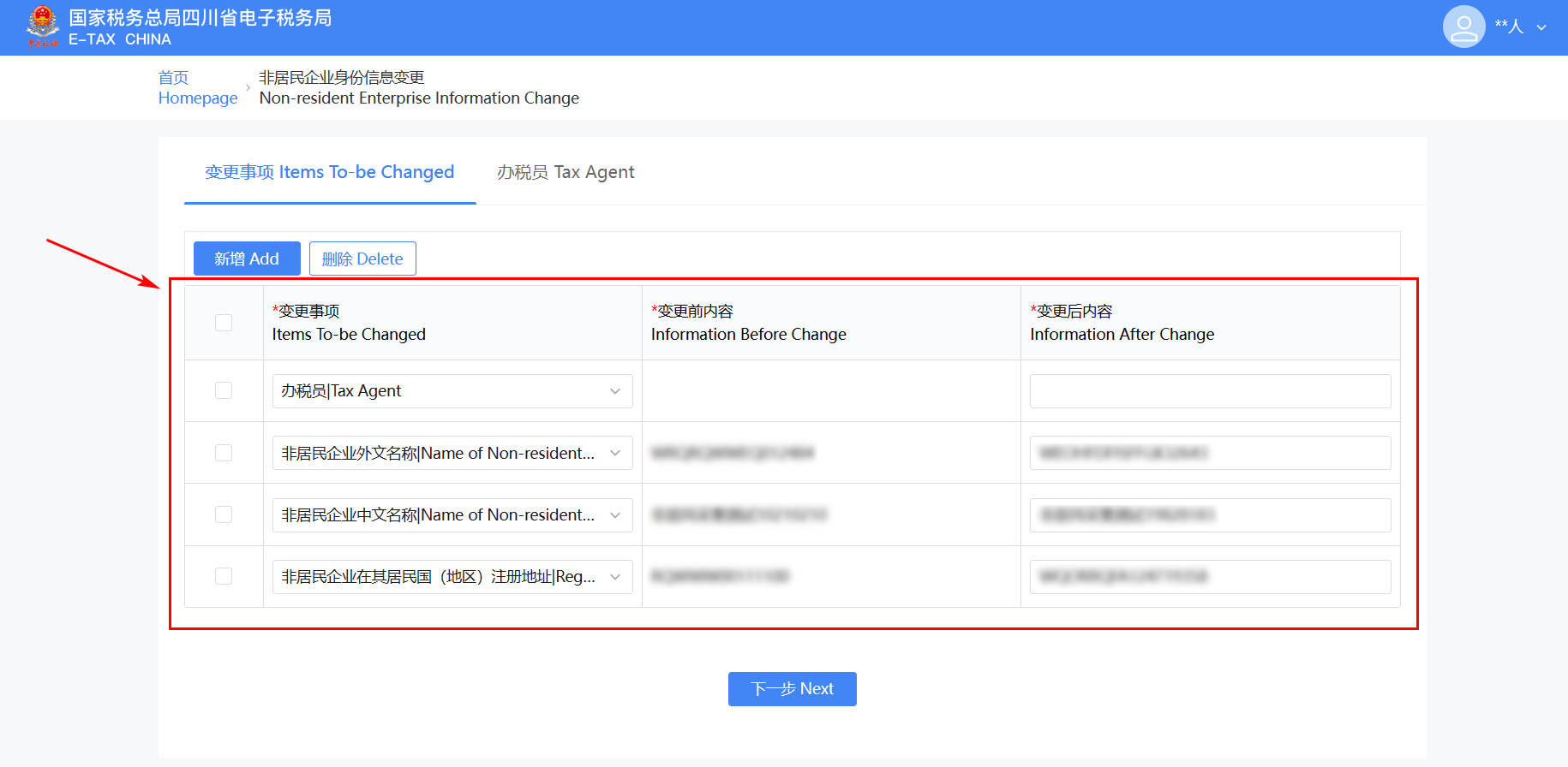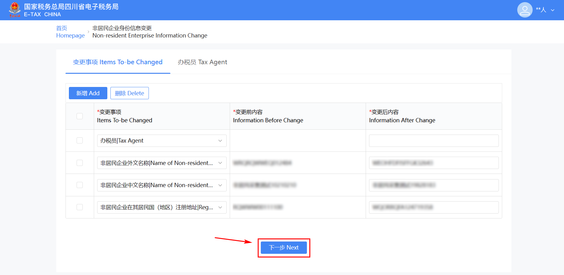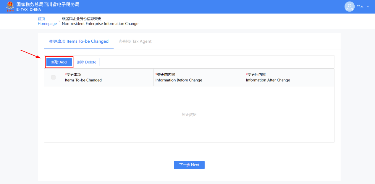 Step 3: Click on “Add” on the “Non-resident Enterprise Information Change” page.