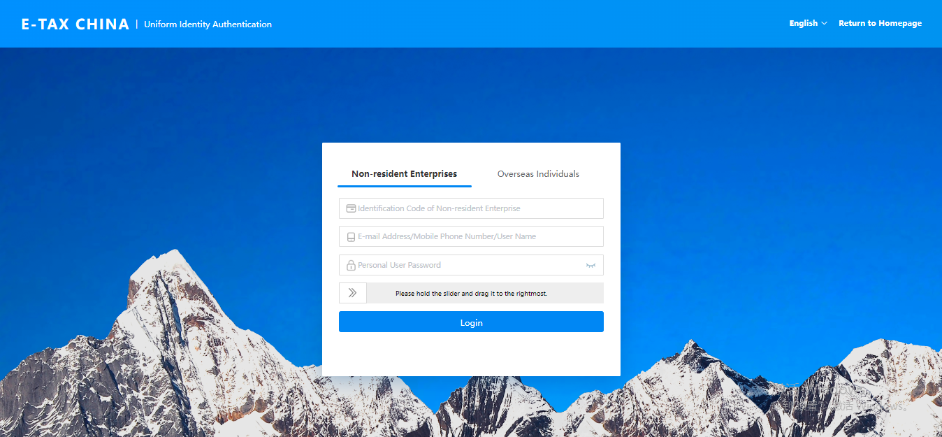 Step 3: Enter the Non-resident Enterprise identification code, email address/mobile phone number/user name and password to complete the slider verification, and click on “Login” to complete login.