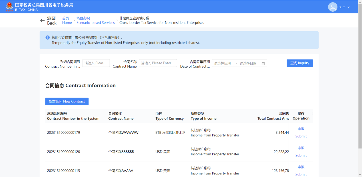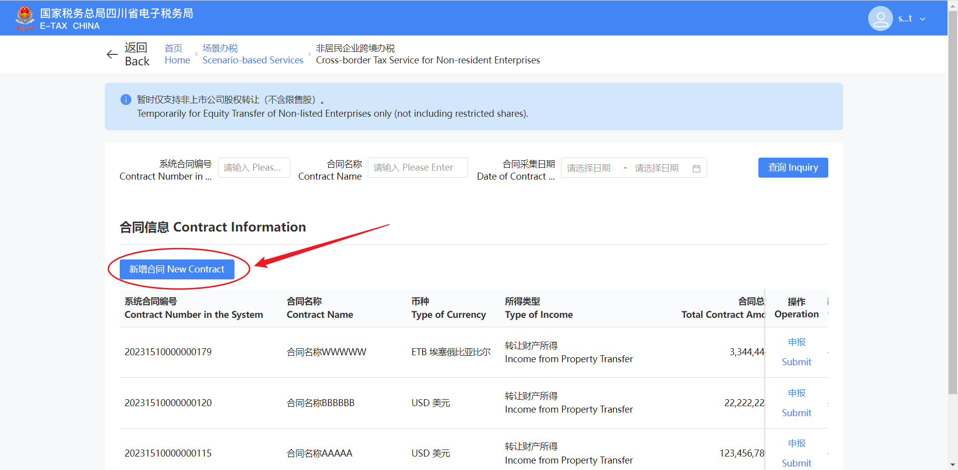 Step 4: Enter the page of “Cross-border Tax Service for Non-resident Enterprises.” If contracts exist, the contract list will be automatically displayed. Otherwise, click on "Add New Contract."