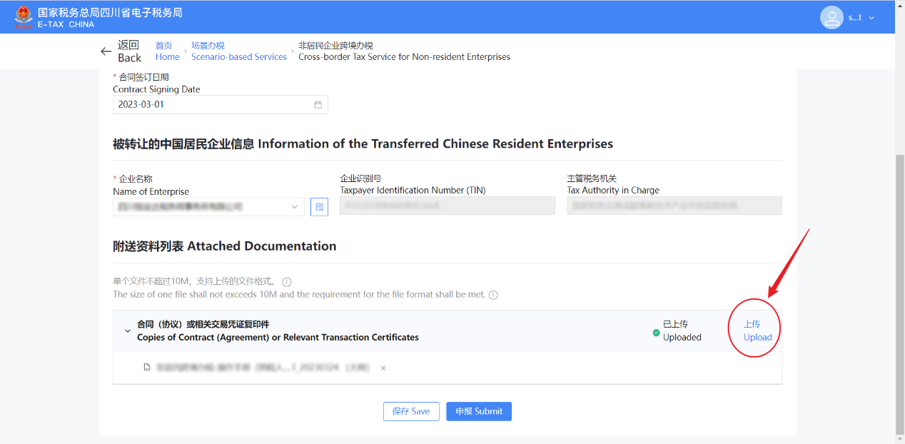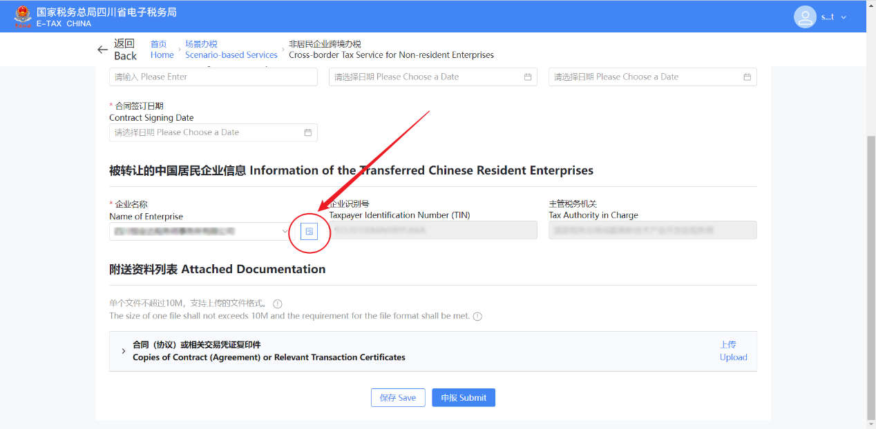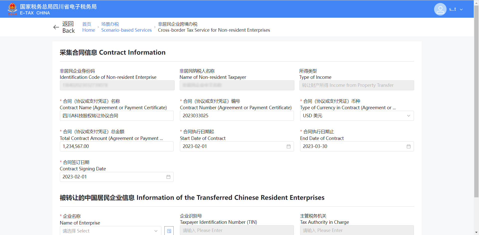 Step 5: Click on “New Contract” or “Add New Contract” to enter the page of “Contract Information Collection.” Enter the Contract Information, select the Information of the Transferred Chinese Resident Enterprises and upload the Attached Documentation, etc. The detailed operating steps are as follows:
