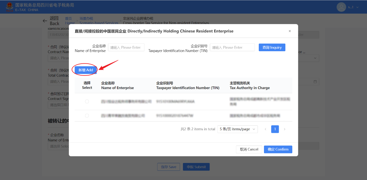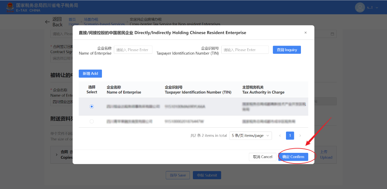 ② Select the “Information of the Transferred Chinese Resident Enterprises,” the pop-up will display the Directly/Indirectly Holding Chinese Resident Enterprise. You can check directly and click on “Confirm”;
