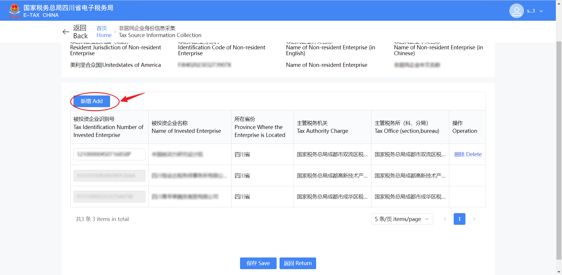 On the page of “Tax Source Information Collection,” click on “Add” and enter the “Tax Identification Number of Invested Enterprise,” the relevant information will be automatically displayed. Please click on “Save” to complete the addition.