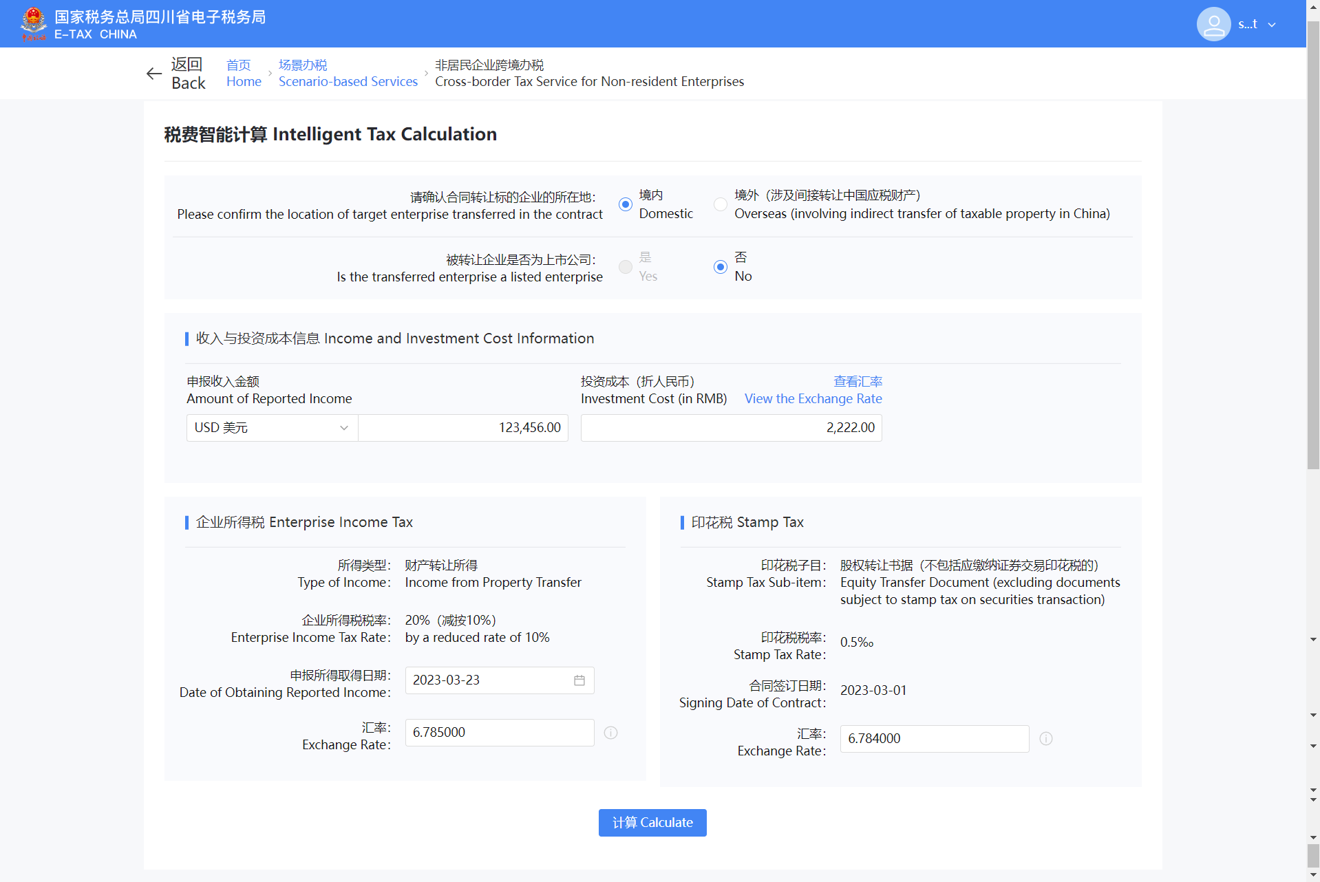 Step 8: Enter relevant information on the intelligent tax calculation page and click on “Calculate.”