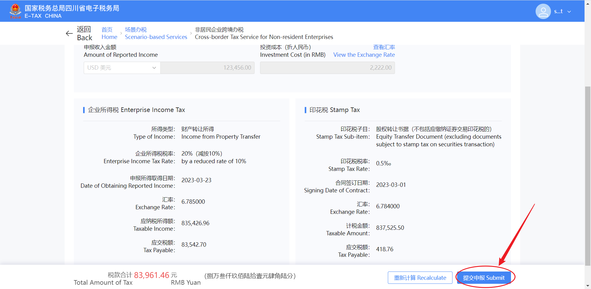 Step 6: After completing contract information collection, click on“Submit” to enter the page of intelligent tax calculation.