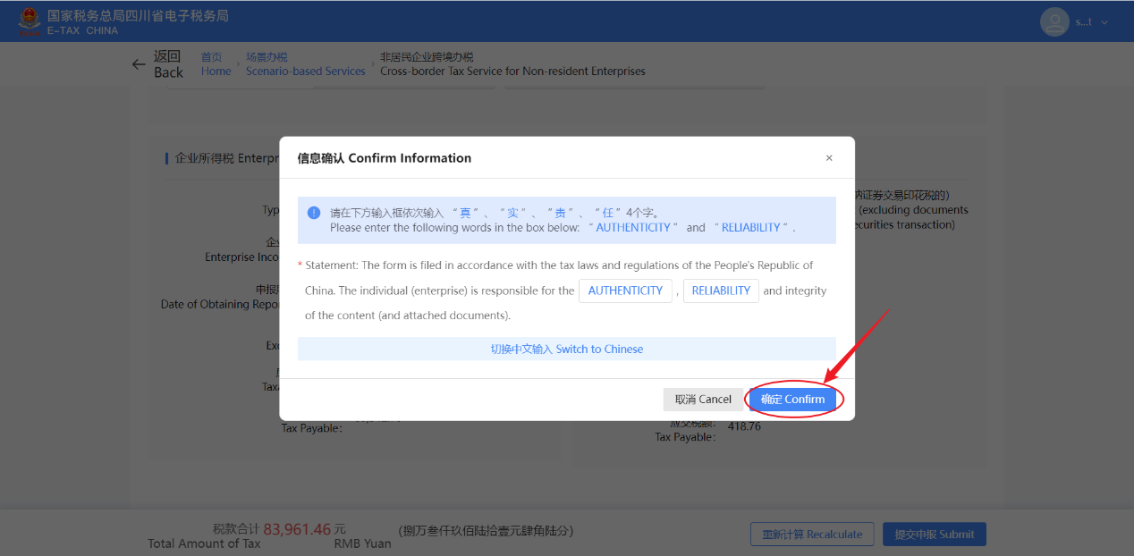 Step 10: After clicking on “Submit,” there is a pop-up to confirm information. You must enter the required information and click on“Confirm.” The input language is switchable between Chinese and English.