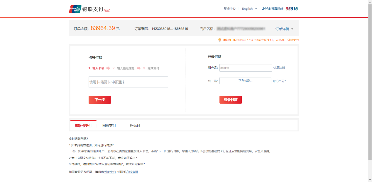Next it will enter the UnionPay page. Enter your UnionPay card information, and then the payment is completed successfully.