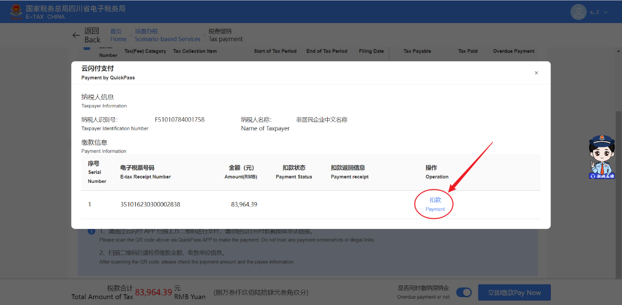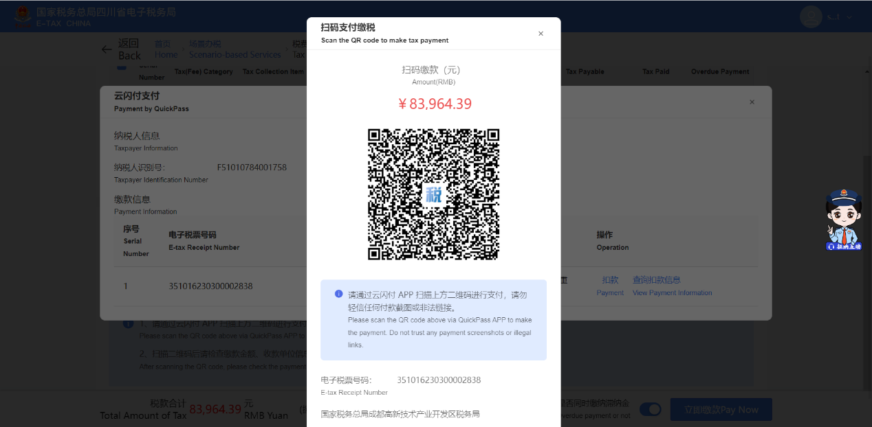 Then it will pop up the Scanning for payment page, please scan the QR code via QuickPass App to complete tax payment.