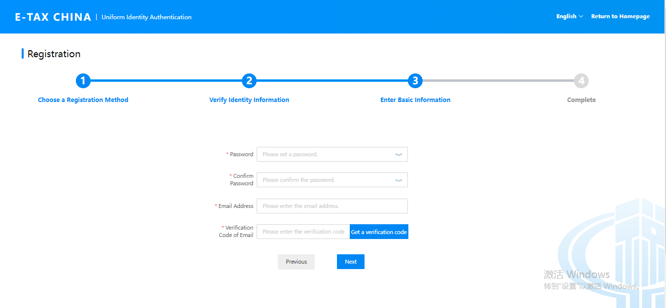 Step 7: Enter the password, confirm the password and email address, and click on “Get a verification code” to obtain the verification code;