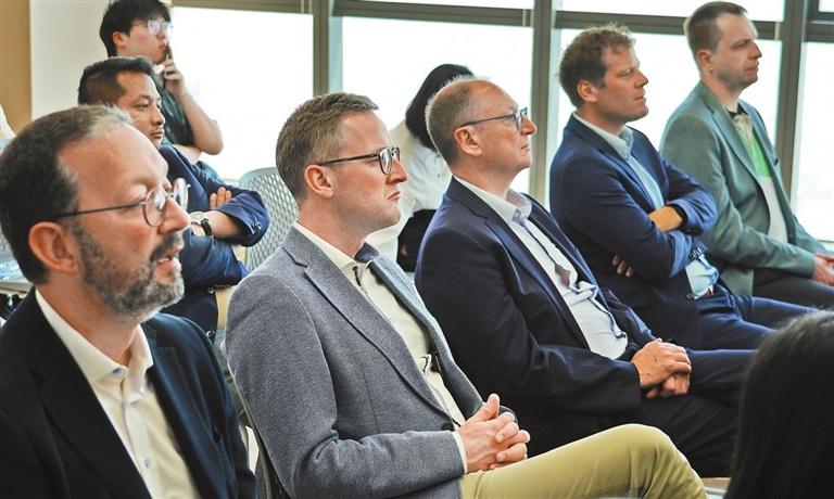 Members of the Luxembourg delegation listen to a presentation during a visit to the Shenzhen Park of the Hetao Shenzhen-Hong Kong Science and Technology Innovation Cooperation Zone on April 15.