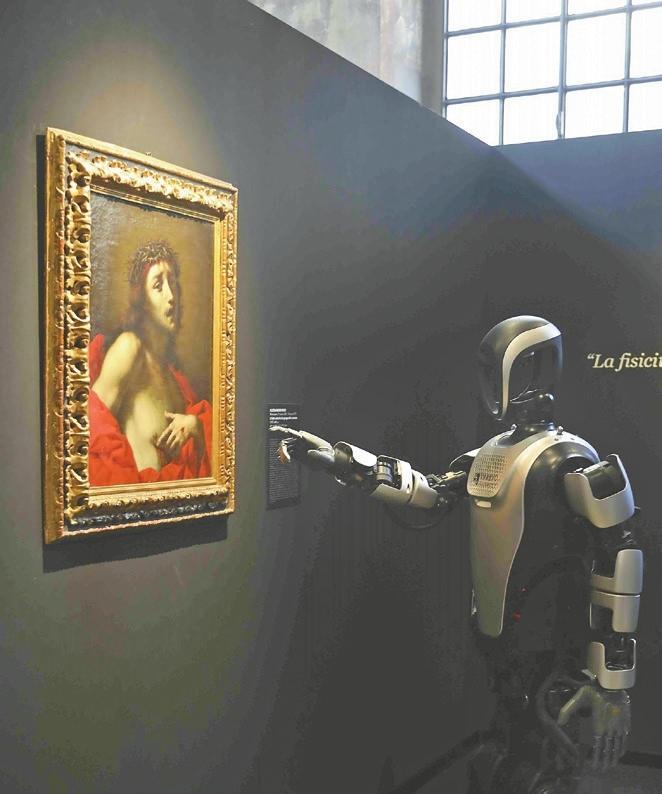 A KUAVO robot points at an oil painting at the opening ceremony April 9.