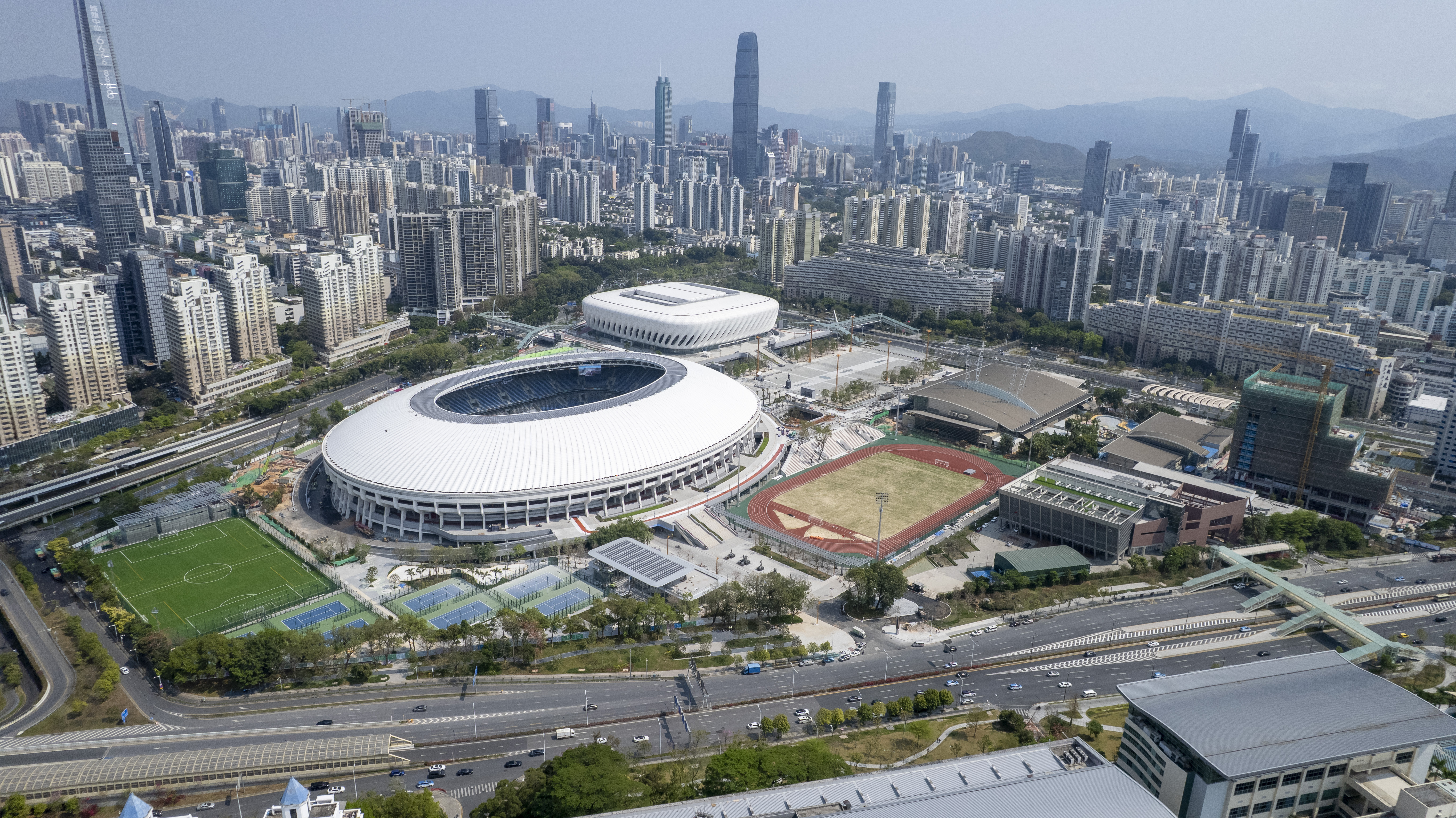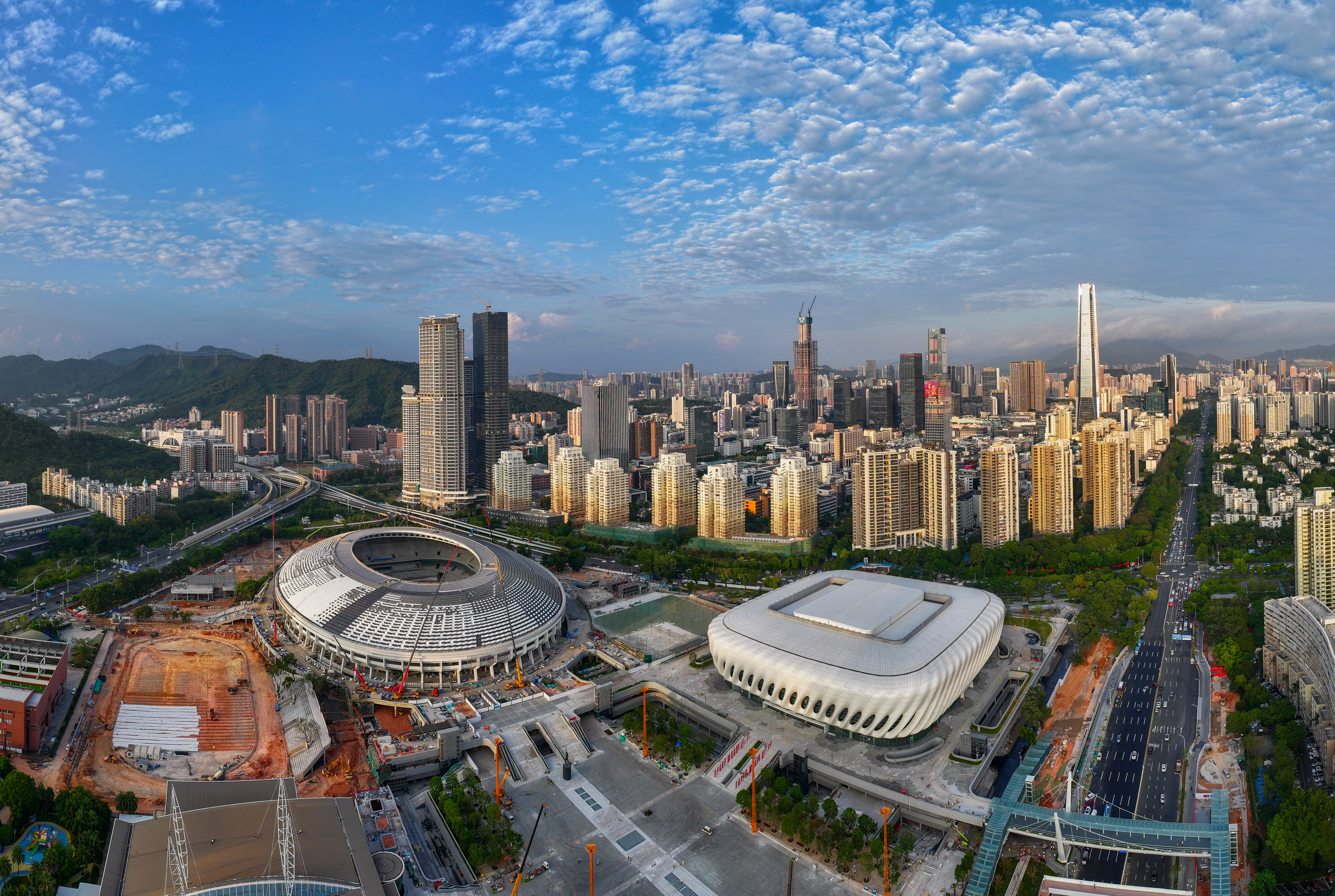 The professional football stadium (left) and retractable-roof stadium at Shenzhen Sports Center