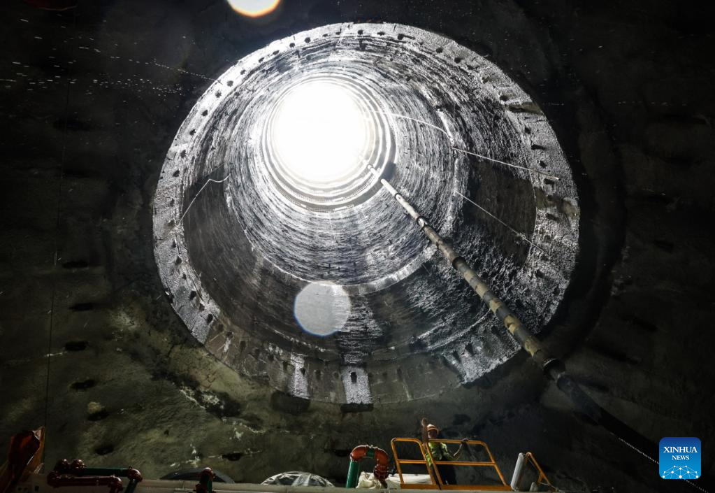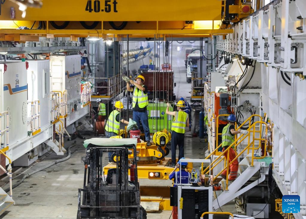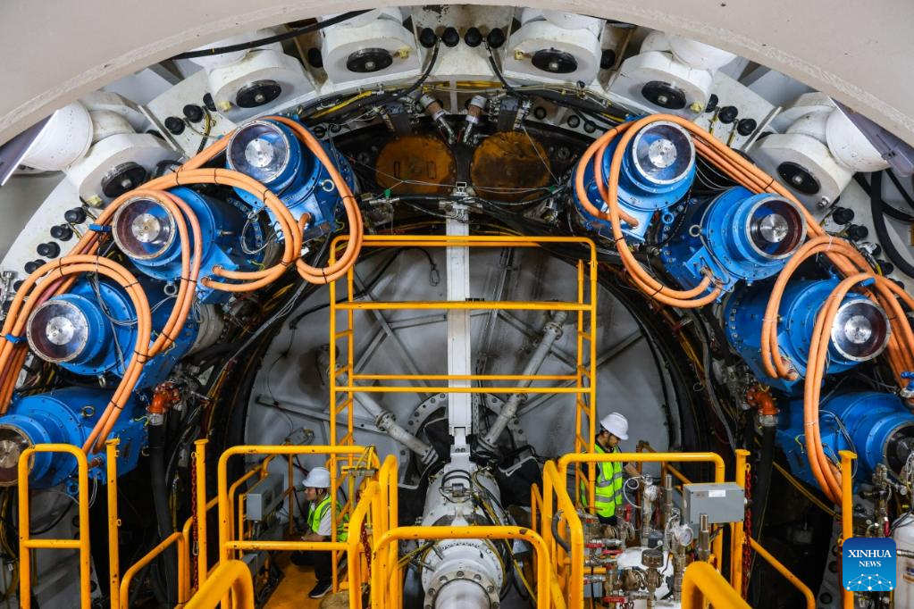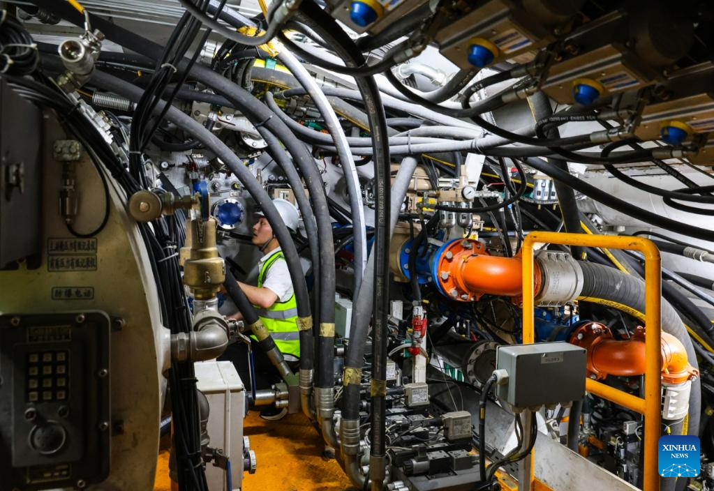 Technicians check a tunnel boring machine (TBM) at the construction site of a tunnel in Pingshan, Shenzhen City, south China's Guangdong Province, Aug. 1, 2025.