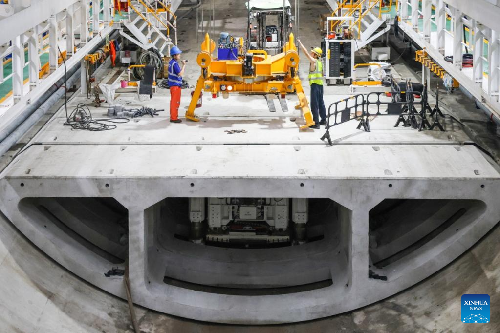 Workers work at the construction site of a tunnel in Pingshan, Shenzhen City, south China's Guangdong Province, Aug. 1, 2025. A giant tunnel boring machine started operation on August 1 to spearhead the excavation works for a tunnel along a railway linking Shenzhen and Shanwei special cooperation zone in Shenzhen.