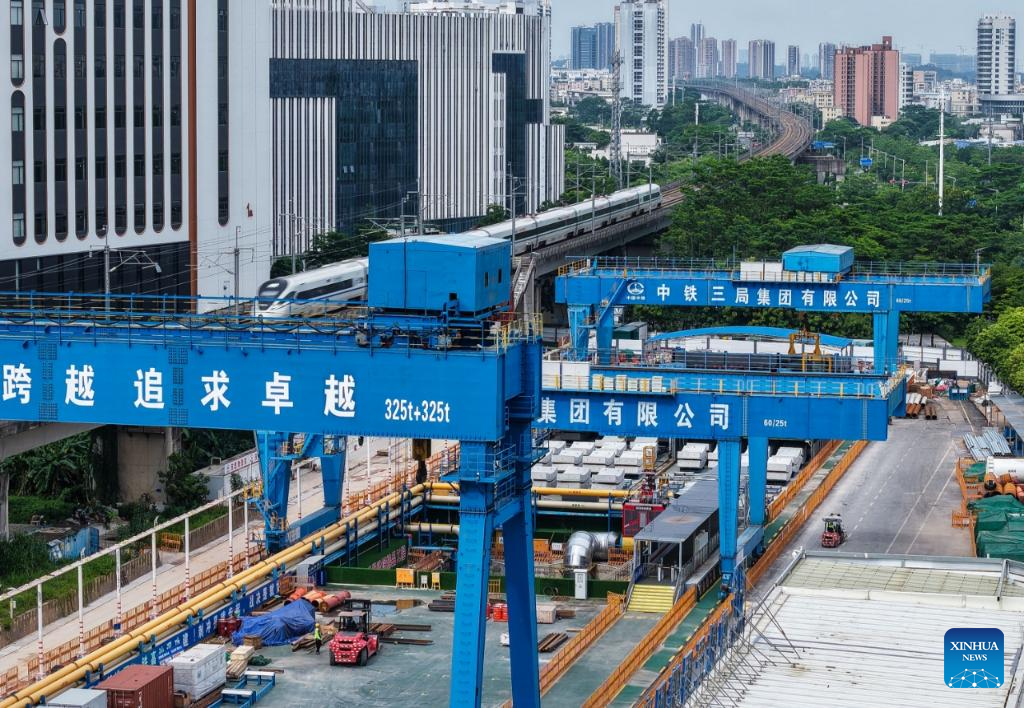 A drone photo shows Xiamen-Shenzhen Railway along the construction site of a tunnel in Pingshan, Shenzhen City, south China's Guangdong Province, Aug. 1, 2025.