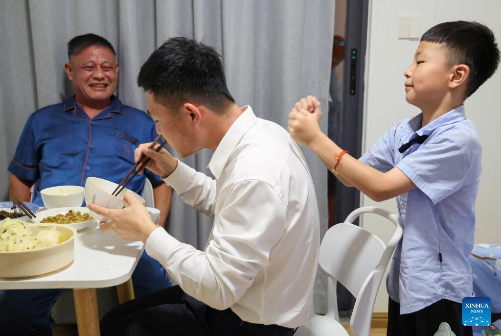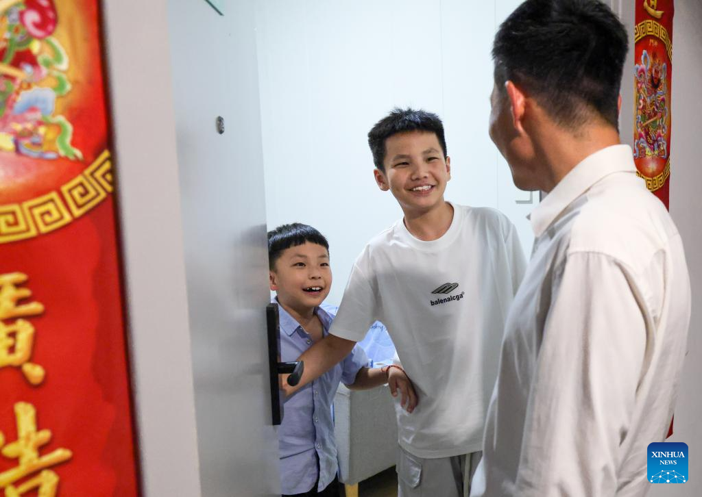 Han Guangbin (R), a ride-hailing driver, is welcomed by his sons after work at the door of the reunion apartment in Shenzhen, south China's Guangdong Province, Aug. 19, 2025.