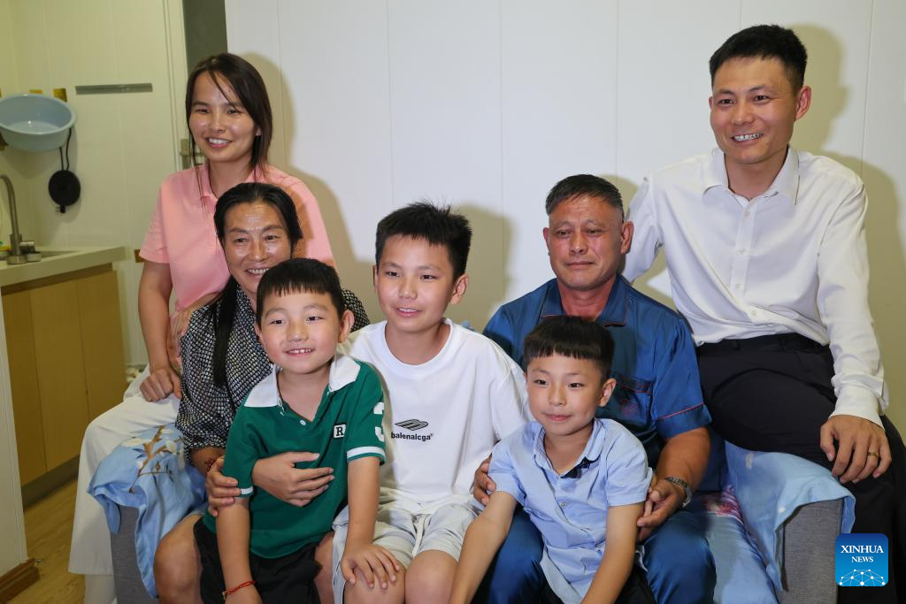 Han Guangbin (1st R, back), a ride-hailing driver, and his family pose for a group photo at the reunion apartment in Shenzhen, south China's Guangdong Province, Aug. 19, 2025.