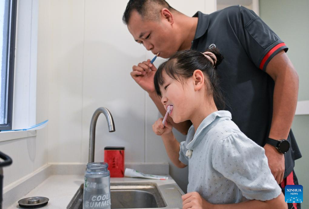 Zou Meng, a courier, and his daughter brush teeth together in Bao'an District, Shenzhen, south China's Guangdong Province, Aug. 19, 2025.
