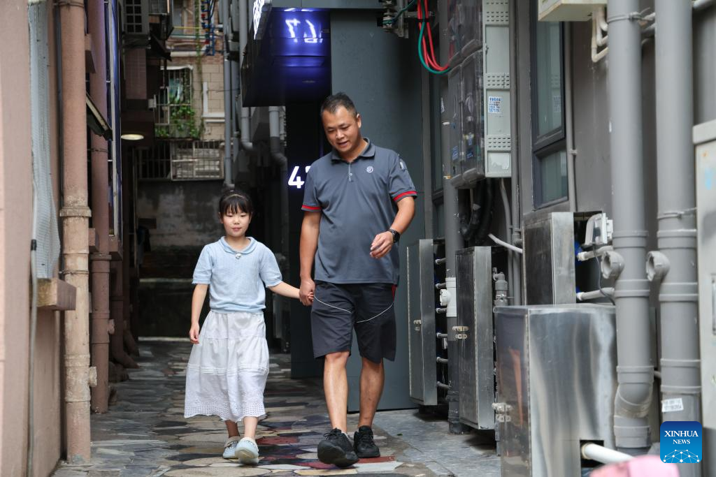Zou Meng, a courier, and his daughter are on their way to receive parcels together in Bao'an District, Shenzhen, south China's Guangdong Province, Aug. 19, 2025.