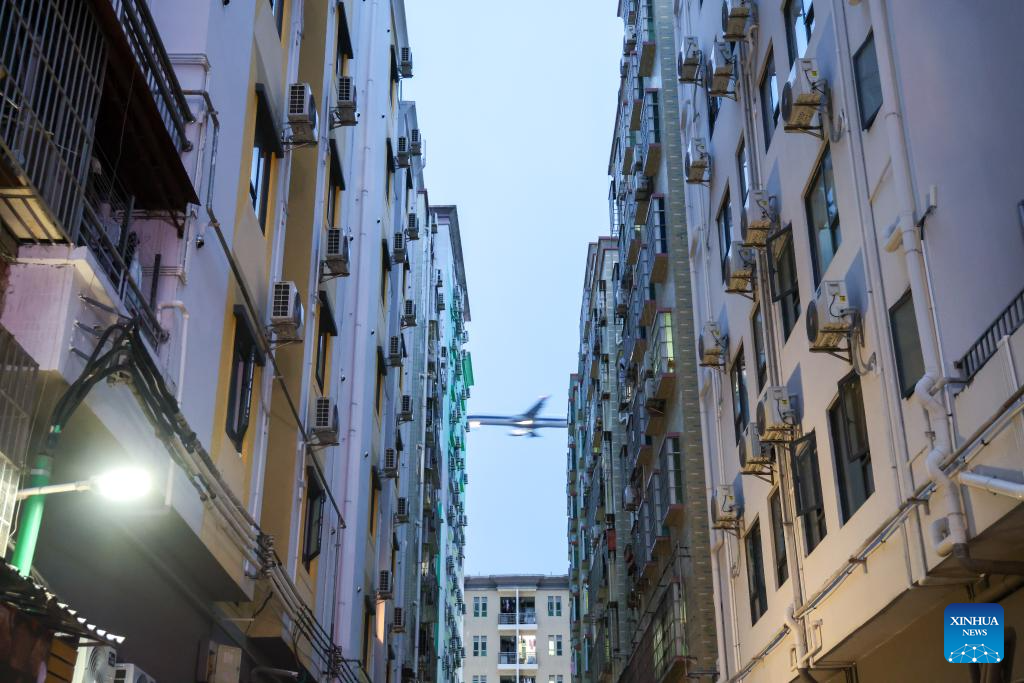 A plane flies over the reunion apartment building where Han Guangbin's family lives in Shenzhen, south China's Guangdong Province, Aug. 19, 2025.