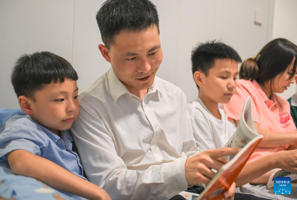 Han Guangbin (2nd L), a ride-hailing driver, reads a book with his son at the reunion apartment in Shenzhen, south China's Guangdong Province, Aug. 19, 2025.